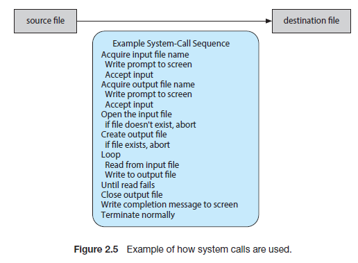 일반적으로 윈도우 운영체제라면 라면 마우스가, 리눅스라면 키보드가 사용자로부터 입력을 받는데 이때 I/O 시스템 콜을 사용한다. 위와 같은 문장을 입력을 받아서 'cp' 프로그램을 실행시키면 먼저 'in.txt' 파일이 현재 디렉터리에서 접근할 수 있는 파일인지를 검사하기 위해 시스템 콜을 호출합니다. 만약 파일이 존재하지 않는 다면 애러를 발생시켜야 하고, 프로그램을 종료하는데 이때 시스템 콜이 사용됩니다. 만약 파일이 존재한다면, 복사한 파일을 저장하기 위해 'output.txt' 파일명이 있는지 검사합니다. 그리고 이 때도 마찬가지로 이 파일 명이 존재하는지 존재하지 않는지 검사하기 위해 시스템 콜을 통해 확인합니다. 그리고 만약 파일 명이 이미 존재한다면, 덮어 씌워야 할지 아니면, 이어서 붙여야 하는지 User에게 물어볼 수 있습니다. 만약 저장하고자 하는 파일 이름이 겹치지 않다면, 파일을 저장해야 하는데 이 때도 시스템 콜을 이용합니다. 그림 2.5는 이 과정에서 필요한 시스템 콜의 호출 과정을 나타낸 것입니다.