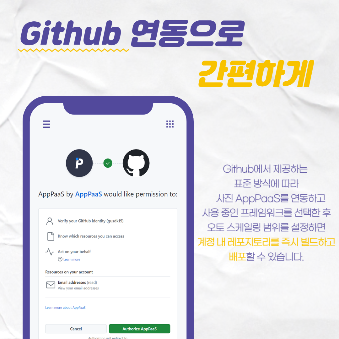 AppPaaS와 연동하고 프레임워크를 선택한 뒤 오토 스케일링의 범위를 설정하면 계정 내의 레포지토리를 즉시! 빌드/배포할 수 있답니다.
