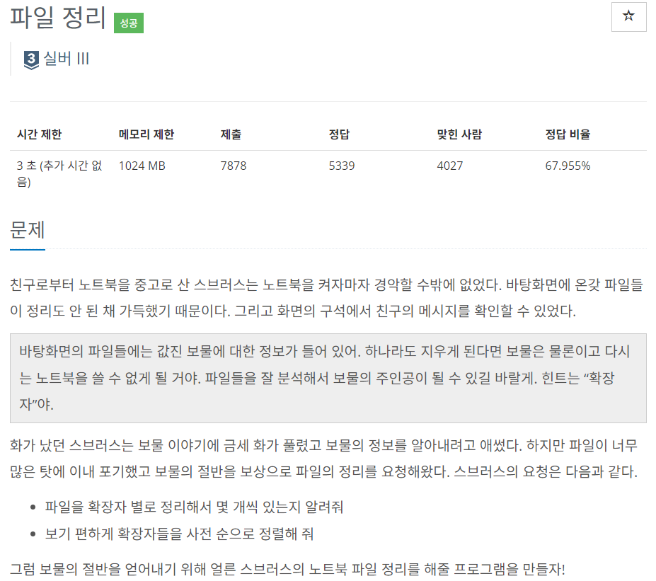cnt items의 key, value (이 문제에서는 각각 확장자 이름, 개수)를 반복문으로 출력해주었다.