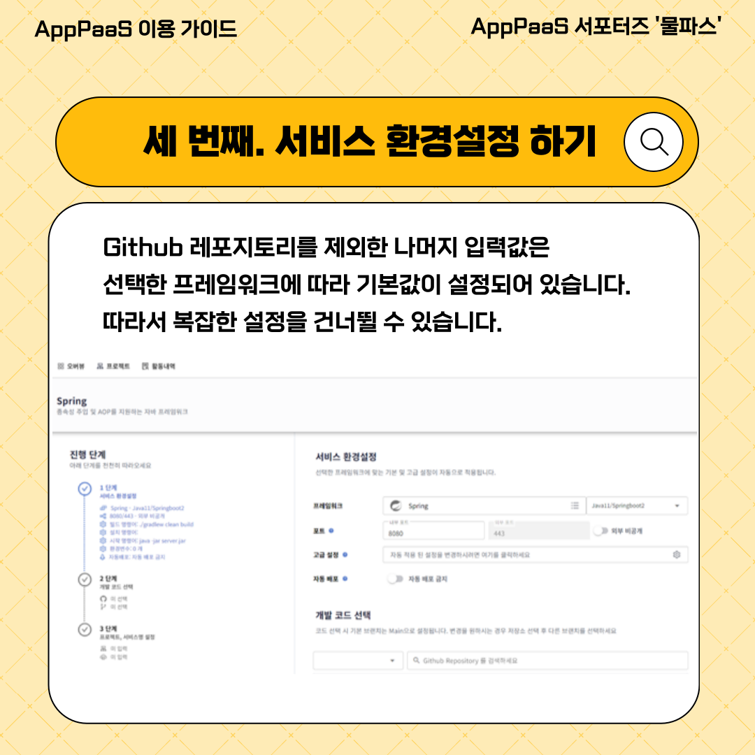 프레임워크나 DB를 선택하면 이렇게 서비스 환경 설정을 할 수 있는 페이지로 넘어갑니다.