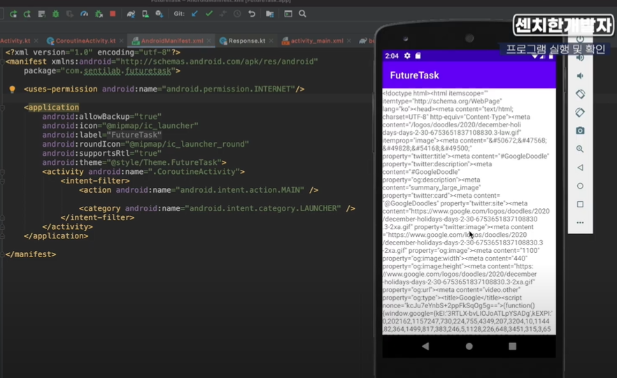 여기부터는 센치한개발자 님의 "안드로이드 스튜디오 - 코틀린, 코루틴과 Http통신"에 나오는 코드대로 작성하였다.