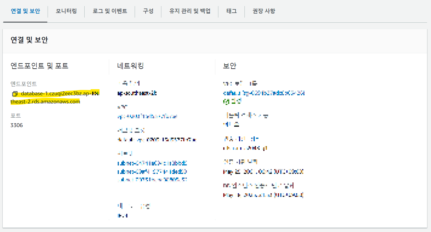 Hostname은 데이터베이스 - 연결 및 보안에 나와있는 엔드포인트,