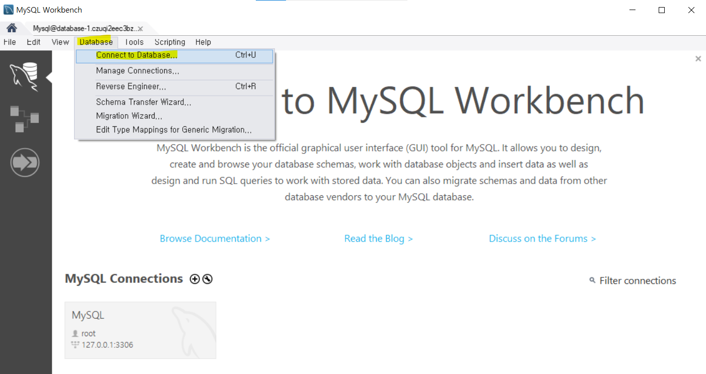 Workbench 상단의 Database - Connect to Database를 클릭한다.