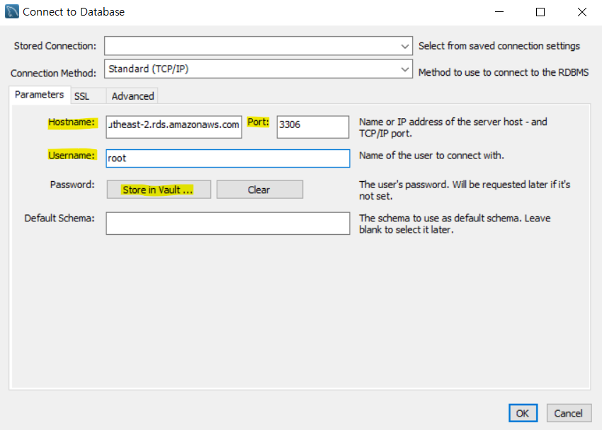 Username은 RDS 데이터베이스 용으로 생성한 사용자 이름을 입력하면 되는데, 나는 root로 지정했었다.