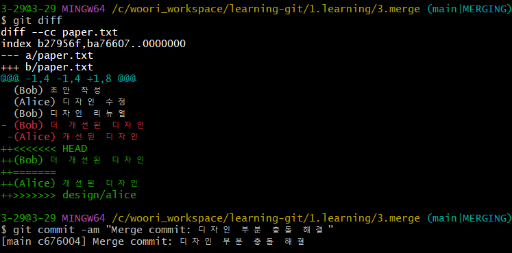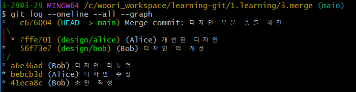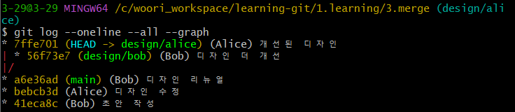 main branch로 돌아와서 design/bob과 design/alice를 순서대로 merge 하려 하면 conflict가 발생한다.