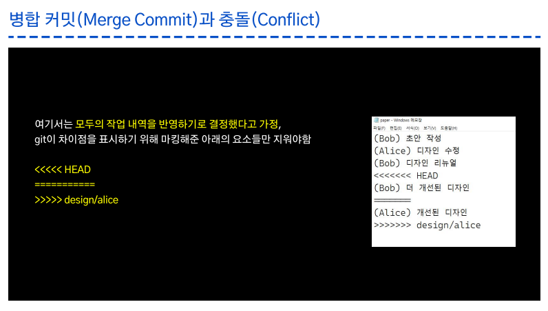 어떤 방법으로 해결하든 충돌을 해결하고 나면 충돌 해결 과정에서 새롭게 변경 내역이 발생했기 때문에 기본값으로는 별도의 병합용 커밋(Merge commit)이 생성됨