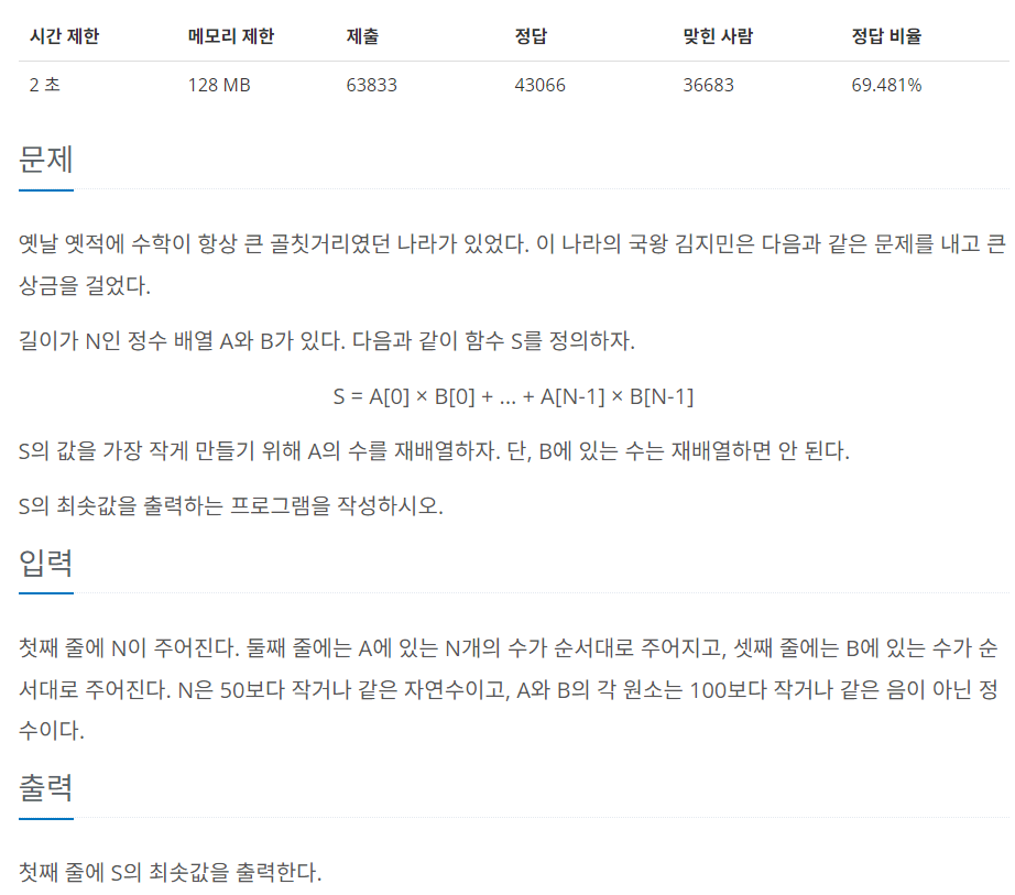 정렬을 한 뒤 A와 B 리스트의 요소를 순서대로 각각 곱해주어야 한다.
