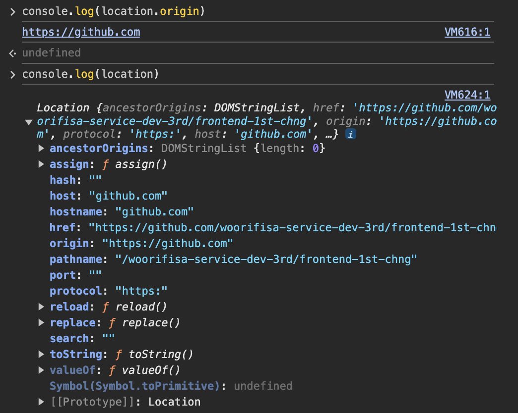 내 깃헙 페이지에서 console.log(location)을 찍어봤다.