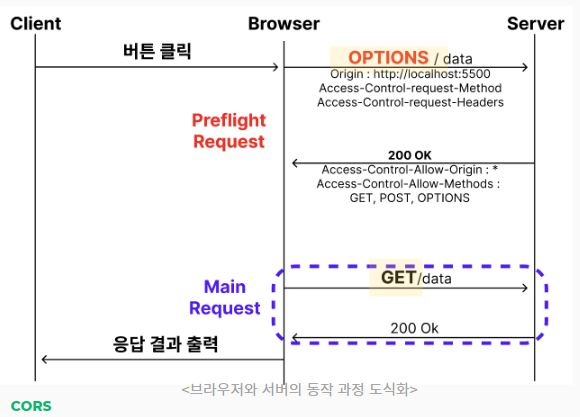 브라우저는 요청을 보낼 때 한 번에 바로 보내지 않고, 먼저 예비 요청을 보내 서버와 통신이 . 잘되는지 확인한 뒤 본 요청을 보낸다.