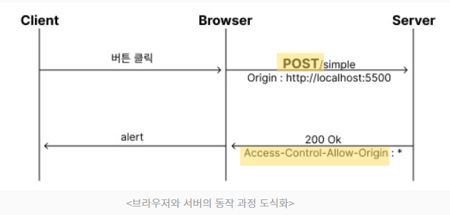 예비 요청을 생략하고 바로 서버에 직행으로 본 요청을 보낸 후, 서버에 이에 대한 응답의 헤더에 Access-Control-Allow-Origin 헤더를 보내주면 브라우저가 CORS 정책 위반 여부를 검사하는 방식이다.