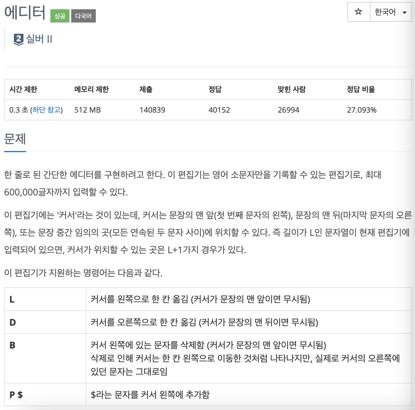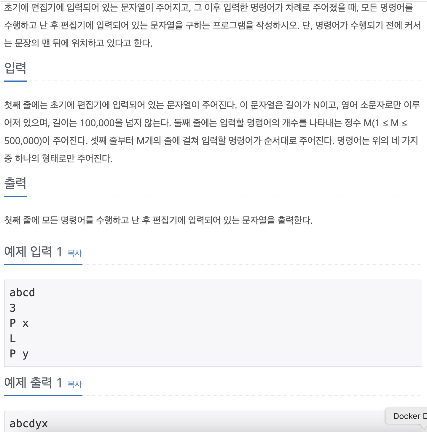 문제 더보기 https://www.acmicpc.net/problem/1406 한 줄로 된 간단한 에디터를 구현하려고 한다. 이 편집기는 영어 소문자만을 기록할 수 있는 편집기로, 최대 600,000글자까지 입력할 수 있다. 이 편집기에