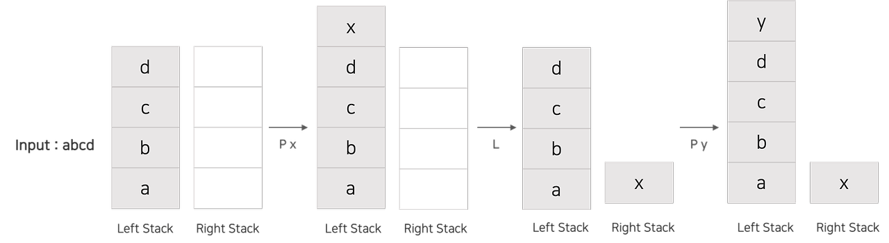 이후 차례로 명령어를 처리하면서 커서가 왼쪽으로 이동하면 왼쪽 스택의 가장 상단 요소를 오른쪽 스택에 pop() 시켜준다.
