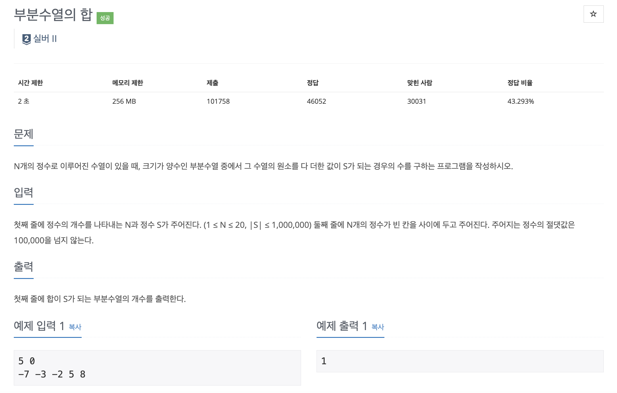 주어진 수열의 부분수열 중 원소를 다 더한 값이 S가 되는 경우의 수를 구하는 문제다.