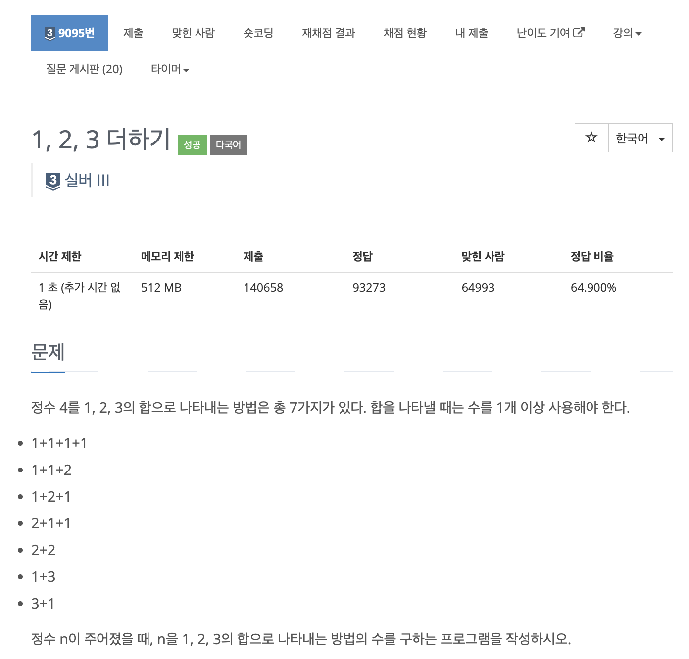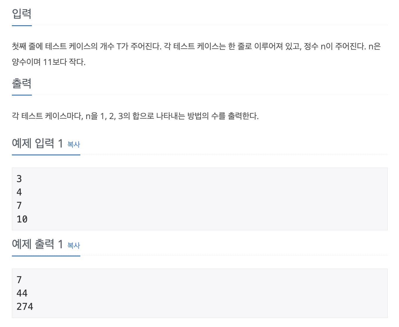 주어진 정수 n(양수, 11보다 작음)을 1, 2, 3의 합으로 나타내는 방법의 수를 구하는 문제다.