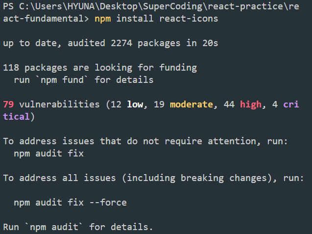 npm install react-icons를 했는데, 계속해서 이런 식으로 vulnerabilities 경고창이 떴다.